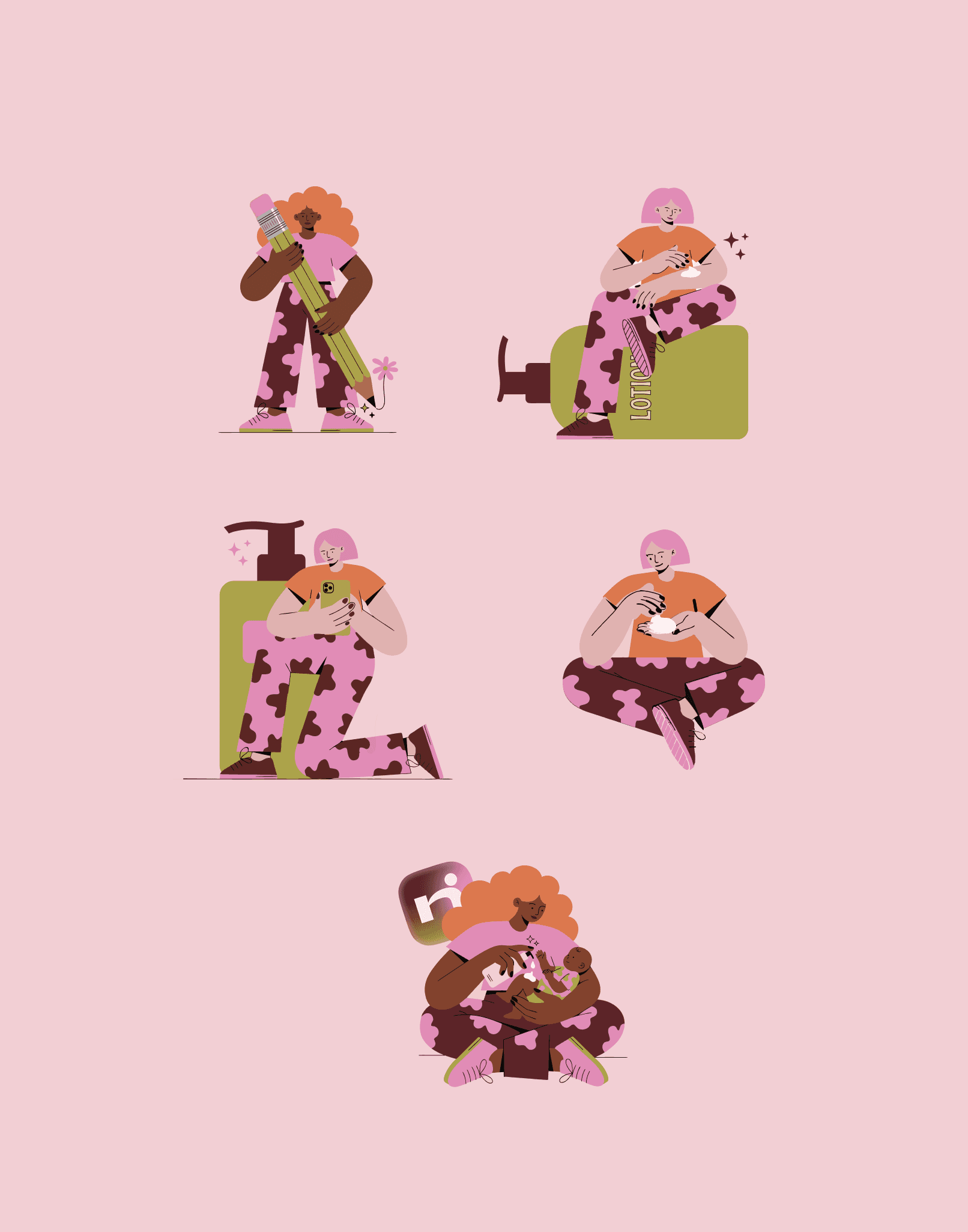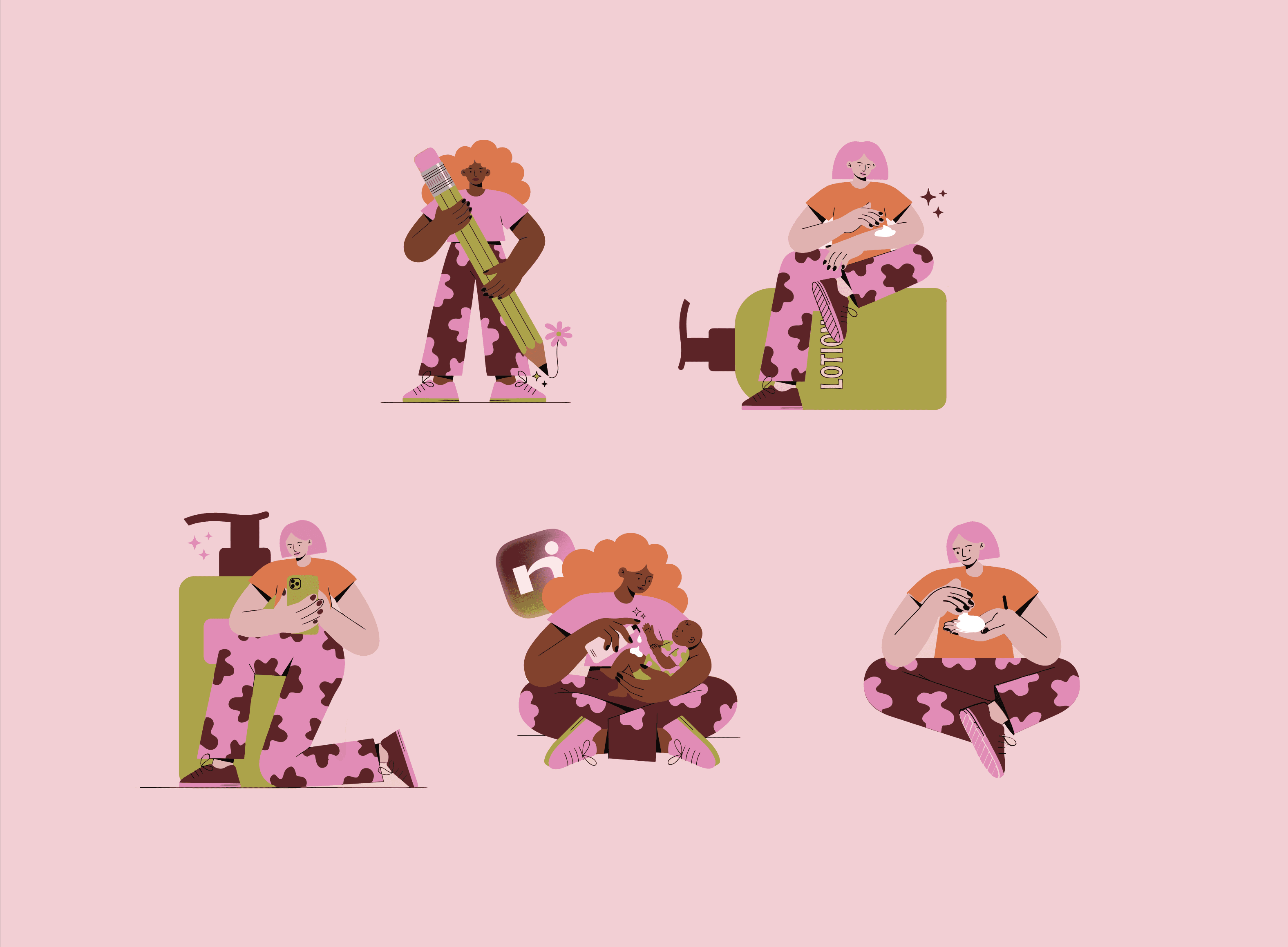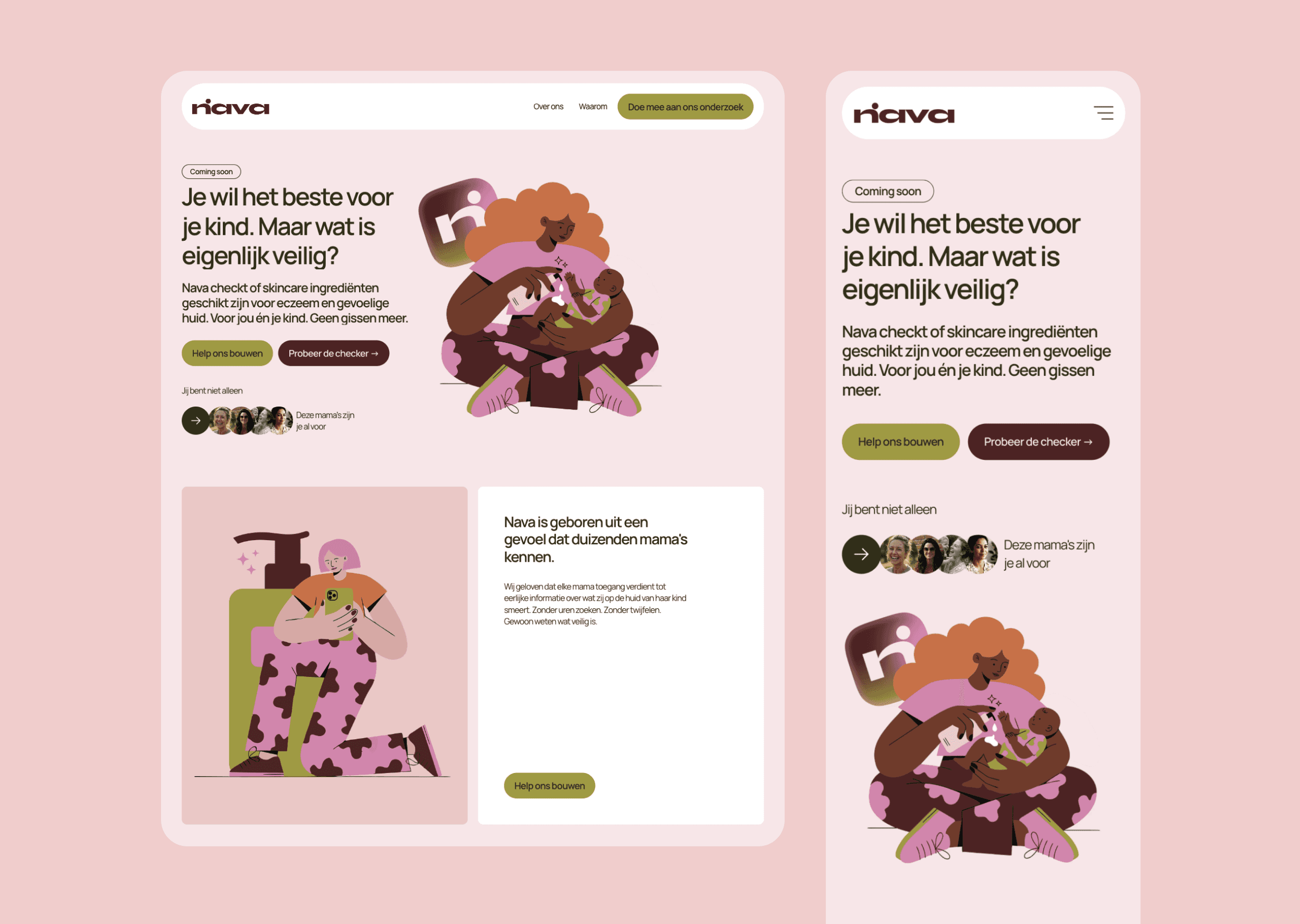 Voor dit project ontwikkelde ik de volledige merkidentiteit van Nava. De uitdaging was een app bouwen die tegelijk toegankelijk en betrouwbaar voelt, warm genoeg voor bezorgde mama's, sterk genoeg om serieus genomen te worden. Het resultaat is een speelse maar heldere visuele taal: een gedurfd roze-groen kleurpalet, illustratieve karakters die de doelgroep direct herkennen, en een logo dat vriendelijk maar zelfverzekerd is.